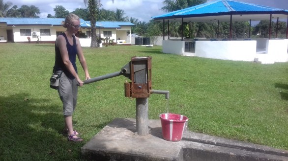 Once in Kakata, we headed straight to the Peace Corps training center. During our visit the newest Peace Corps volunteers had just arrived but were off one site visits (like Kim did) so we had the facility basically to ourselves. Instead of one building it is more of a compound with multiple buildings and plenty of green space in between. We walked around and explored the training center and dorms and then practiced using the pump to draw water.