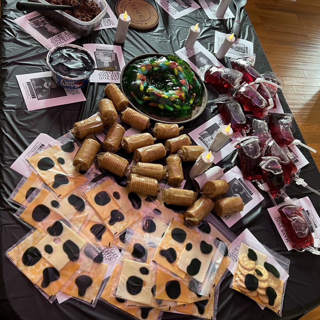 We paired our Headless Hunt with a “Death Day” themed snack break to celebrate Nearly Headless Nick’s 500th Death day! Treats included “moldy” cheese and crackers (thanks to some mold-printed baggies similar to these on Amazon), a gummy worm jello cake (with “moldy” cool whip thanks to black food coloring!) and “blood” to drink from IV bags –you can put whatever red drink you like into these drinkable fake IV bags! (Yes I know ghosts don’t drink blood but we took some creative liberties!)