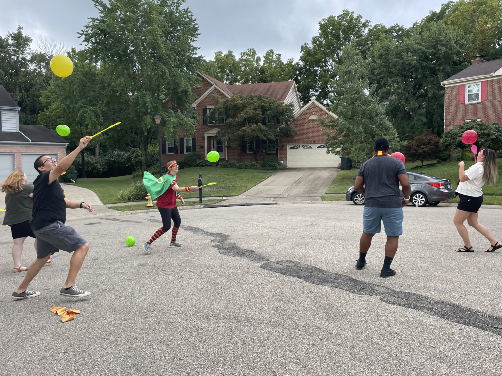 In this activity, players take turns throwing darts at a board of balloons trying to pop all the other house’s colors! We took turns alternating through all the players and teams until each player had had their turns (How many turns each team/player gets may depend on how many people you have). We awarded points at the end based on how many of each color was still on the board – the most balloons remaining earned the most points.