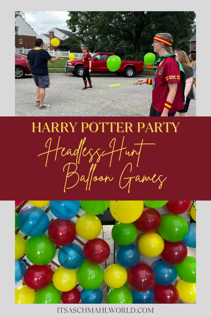 For one of our annual Harry Potter parties, we had a blast hosting a “Headless Hunt” tournament inspired by Nearly Headless Nick’s ambition to join the exclusive group of beheaded ghosts in Harry Potter and the Chamber of Secrets! But rather than using severed heads, we used balloons to play several quick carnival style games!